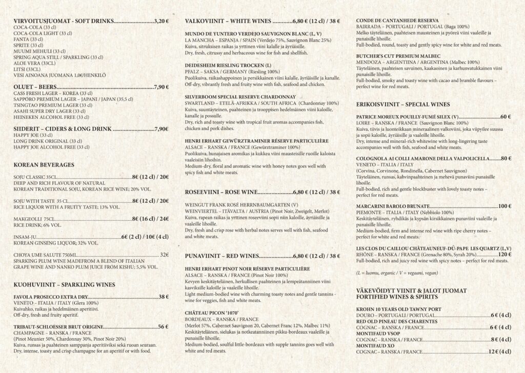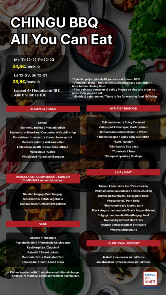 Lisähinnalla tilattavat erikoislihat pitää erikseen tilata 2 päivää etukäteen, soita 0505126568 tai lähetä sähköpostia chingukalasatama@gmail.com
