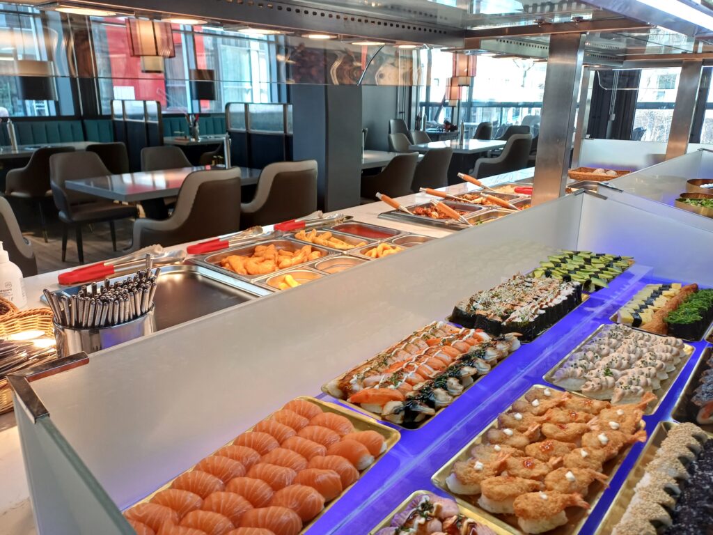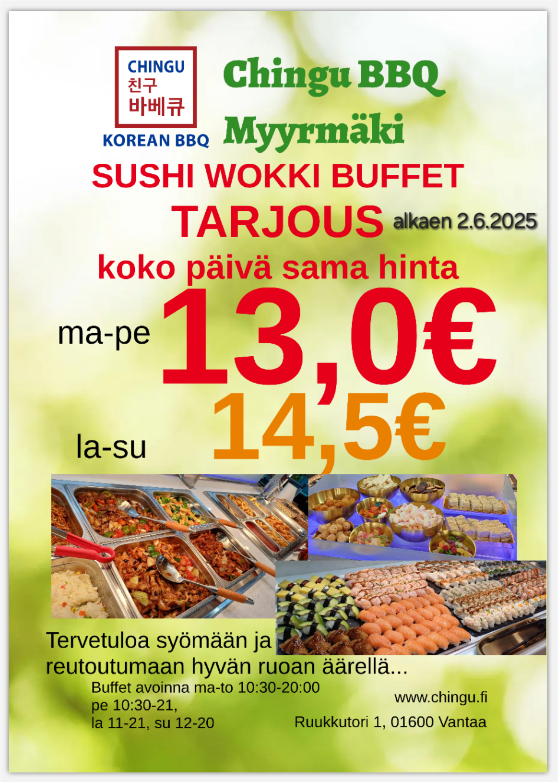 Meillä on koko päivän runsas lounas buffet, joka sisältää sushia, wokkeja, salaattibuffetin ja jälkiruoka makeispöydän. Juhlapöytä on katettu. Sinun tarvitsee vain saapua paikalle.